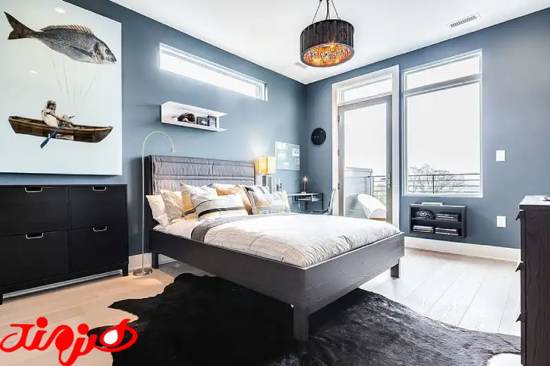 رنگ آبی نماد آرامش است. ترکیب آبی با رنگ طوسی حس آرامش را تقویت می‌کند و برای اتاق خواب و نشیمن بسیار مناسب است چراکه رنگ آبی هماهنگی بی نظیری با رنگ طوسی دارد.